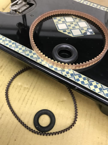 モーターベルトと下糸巻きゴム輪です。 上が新品、下が古いベルト、ゴム輪です。モーターベルトも10年位使用すると劣化が進みますので要交換。