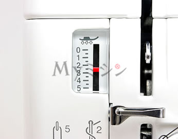 0が押さえ圧無し、目盛5が最強圧と分かりやすい表示なので、薄地〜厚地まで自由に数字で押さえ調整ができますし、後日、類似の生地を縫う際も、押さえ圧を再現するのが簡単です。