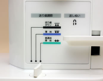 縫われる素材、厚さにより一針間隔を調節します。薄地は1.5mm〜2.0mm、普通地は2.5mm〜3.5mm、厚地は最大7mmまで調節可能なります。