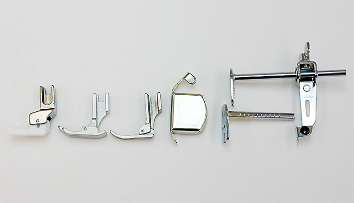 コンシールファスナー押え、ファスナー用片押え、三つ巻き押えが標準装備です。