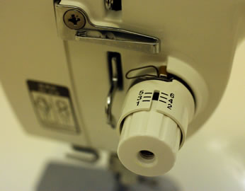 家庭用ミシンではボビンの巻きがいっぱいになると、ミシン本体の突起部分に糸が当たり、その摩擦により空回りするタイプがほとんどですが、職業用ミシンは巻き終わると自動的に回転が止まります。