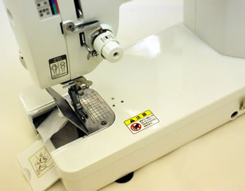 通常、押えをあげた場合は、7mmまでしか上がりませんが、ニーリフターを使うことで12mmまで押えの上げ下げが可能となります。常時、両手が使えますので大きな生地を縫う際の切りまわしなどの場合に大変重宝する機能です。
