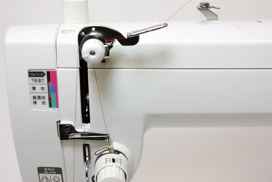 押え圧が赤い目盛り表示なので、ひと目で分かります。縫う素材、厚さに合わせて、自由に押え圧調節が可能です。