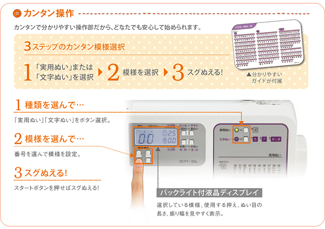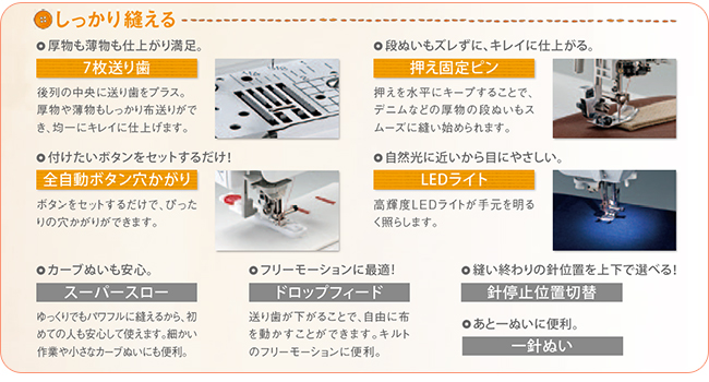 「7枚送り歯」「簡単2ステップ糸通し」でより簡単な操作性。そして充実の「40模様+文字縫い機能」も内蔵しています。ブラザーS71-SLは、ミシンは初めてだけど手軽に使えたらいろいろ試してみたいという方や、入園準備やお子様の小物中心にソーイングを始めたい方にピッタリと感じていただけるミシンです。