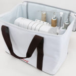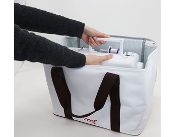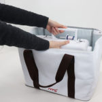 素材、サイズにこだわり、家庭用ミシン、ロックミシン兼用で使用できるよう、数回に及ぶサンプル制作を行い完成したキャリングバックは、バックの上部を開けて上部からミシンを収納できる形状となっていますので、簡単に収納ができる設計になっています。また空いたスペースに付属品も収納出来ますので、ミシン一式をひとまとめて保管できます。