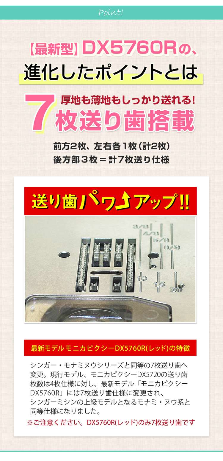 これまで、耐久性、パワーに定評があった電子ミシン7520ですが、送り歯に関しては4枚であったため、素材によって布送りに差が出たりすることもありましたが、進化した5760は送り歯7枚にすることで、上位機種のコンピューターミシンと変わらない安定した布送りを実現しました。
