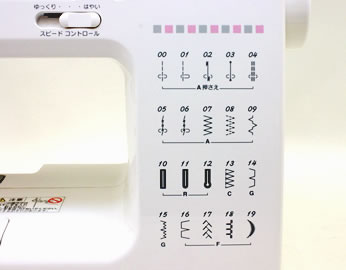 直線縫い(中基線、左基線)、直線自動返し縫い、直線自動止め縫い、伸縮縫い(ニットステッチ)、ジグザグ縫い、パッチワーク縫い、まつり縫い、シェルタック縫い、スカラップ縫いなど、実用縫いには十分なステッチが揃っています。