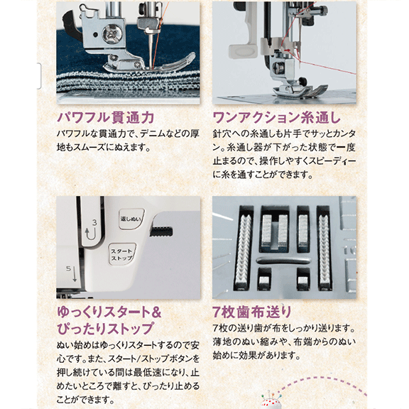 基本的なソーイングに必要な直線縫い、かがり縫い、まつり縫い、伸縮縫い、ボタンホールなどの他、はと目かがり、ドロンワーク、