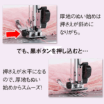 縫い代が重なった段差を縫う際に押え固定ピンをうまく利用することで、縫い目が安定して