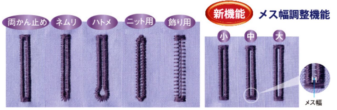 ・自動ボタン穴模様15種(センサー式/固定板つきボタンホール押え/メス幅調整機能あり)