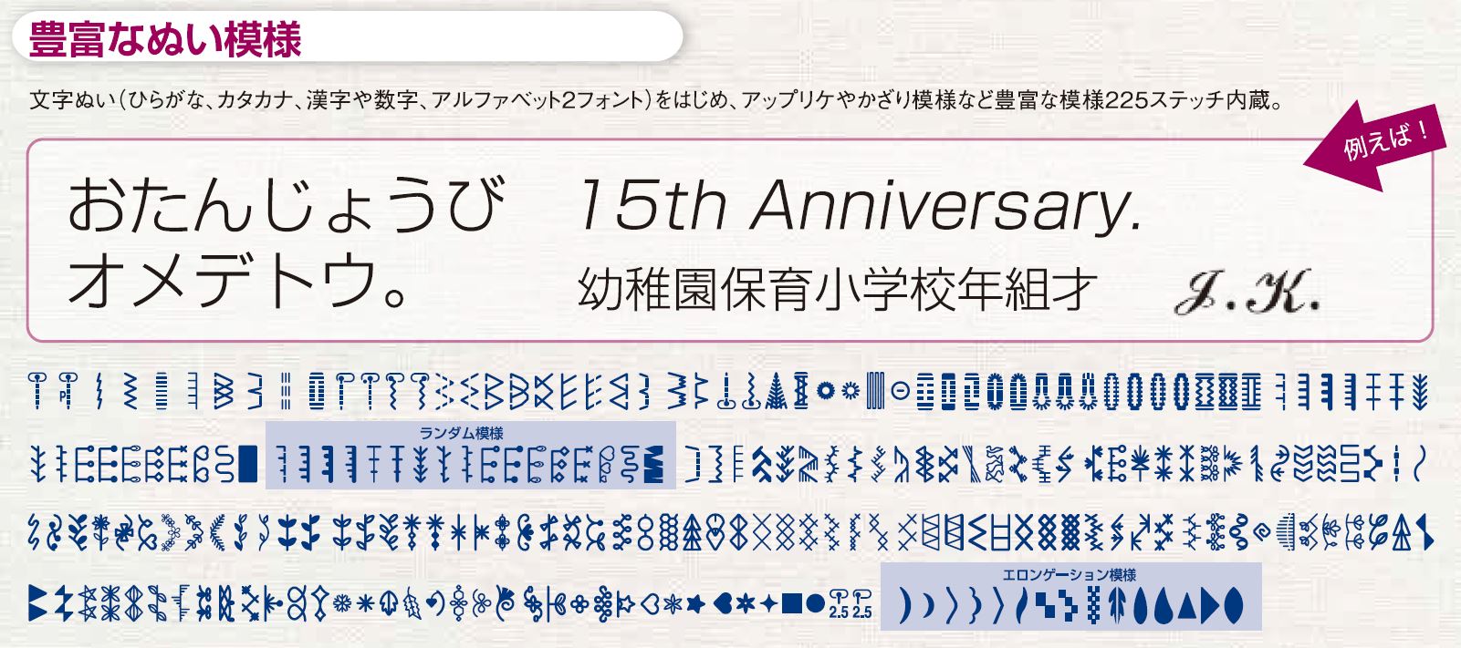 をはじめ、アップリケやかざり模様など豊富な模様225ステッチ内蔵。
