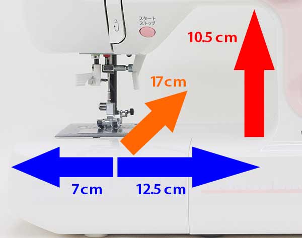 コンパクトミシンは、フルサイズミシンに比べ、全体の大きさが異なる分、ふところが小さくなってしまいます。