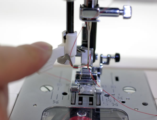 自動糸通しレバーを下ろし、糸を水平に針に押し出すだけで、簡単に針穴に糸が通ります。