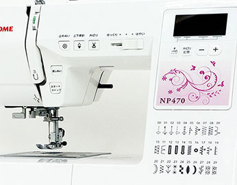 本機種の主な機能や、特長をご案内します。最新機種ジャノメNP350の上位機種として、同時発売のNP470。これまで多くのお客様より、便利機能として喜ばれている「自動糸切機能」「7枚送り歯水平送り機構」を加え、より簡単な操作性と、作品の仕上がりが、綺麗になる工夫が加えられた機種になります。ミシン初心者の方や、予算を抑えつつも、ワンランク上の機種をとお考えの方に、より自分らしさを表現できるNP470をオススメします!