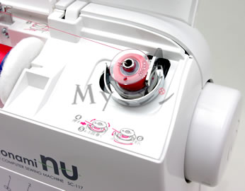 モナミ ヌウSC117に装備されているらくらく下糸巻きは、ボビン軸へ数回巻き付けて余分な糸を内蔵カッターで切りだけで、後はスタートストップボタンを押すだけで、誰でも簡単に下糸巻き(ボビンの糸巻き)ができる便利な機能です。