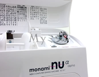 SC300、SC307といった旧モデルでも特長だった文字縫い機能に加え、専用刺しゅう機(EU-2)の取り付け可能となり、さらに下糸らくスルーなど使いやすい機能も多数追加されリファインされた新型モデルが、この「モナミヌウアルファSC317」です!