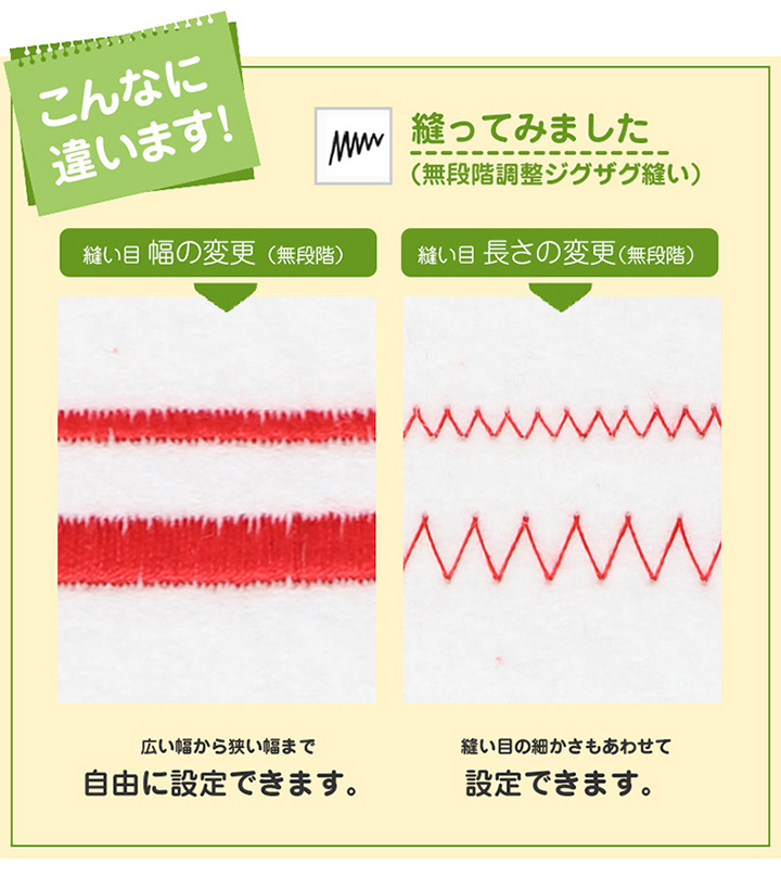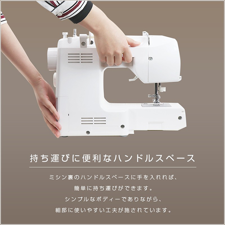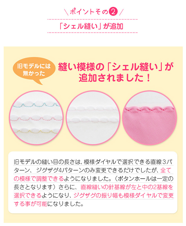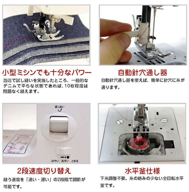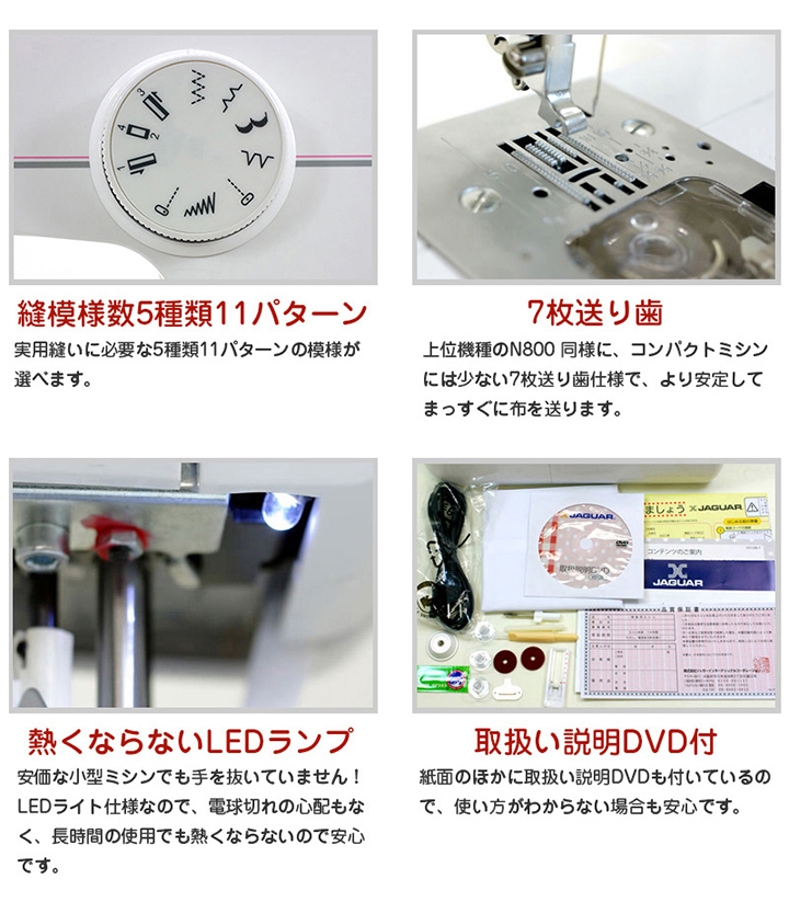 縫い模様7種類9パターン、自動糸通し器、ピッチダイヤル(新機能!)、2段階スピード切り替え、7枚送り歯、全回転水平釜 、LEDランプ、上糸掛けプリント、フリーアーム