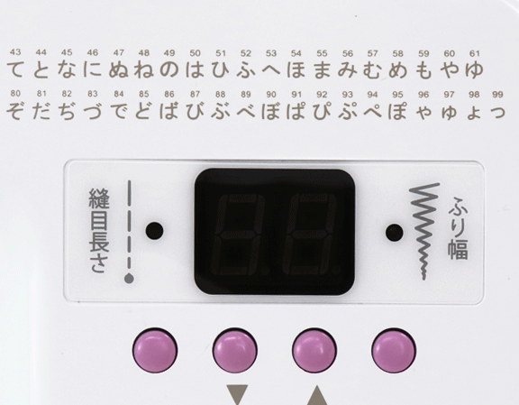 模様数は、ひらがなの文字縫いを含め99種類あり、1〜24までが、実用模様縫い、15〜24までが数字25〜99までがひらがなの文字縫いとなります。