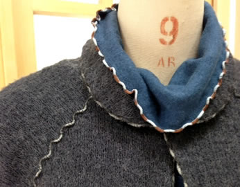 某百貨店有名ブランドのジャケットを参考に、インナーのハイネックも含め、ベビーロックのBL69WJウェーブ機能を活用したコーディネートです。